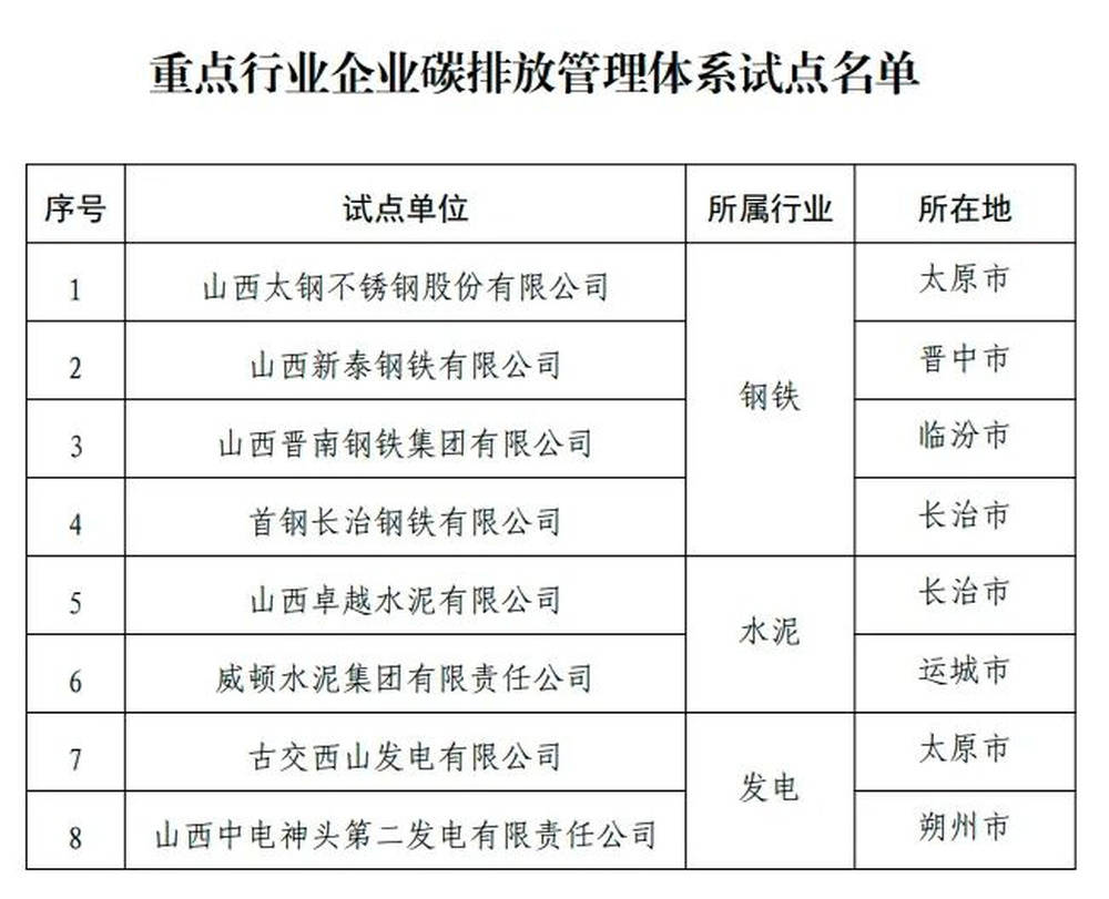 日前,山西省生态环境厅公布重点行业企业碳排放管理体系试点名单,此次共有8家单位进入试点名单。
